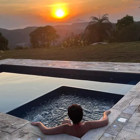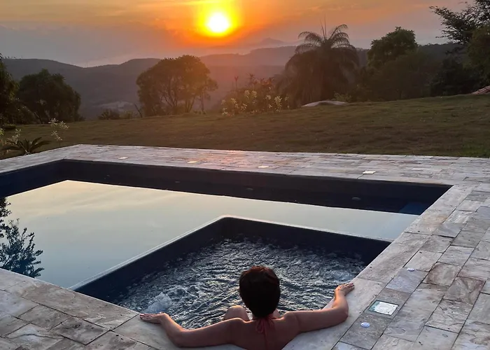 Recanto Da Natureza Itabirito villa features a patio with views of the river as well as a swimming pool.